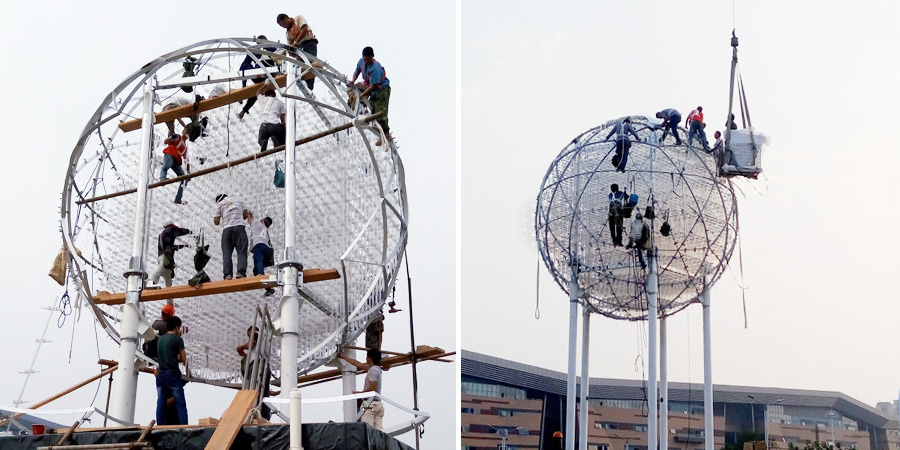 · 扬州2500年城庆的“月之眼”项目,球体直径6米,离地4米,采用了钢结构拼接式玻璃外罩、内部穿插式灯管的手段有效地解决了球体造型显示、防水防护、内部灯具安装等难题。装置共计47669个LED像素点。在控制上采取了多台以太网联机主控制器及音频控制器,配合多级的控制模组整体控制,以3D动画效果展现了扬州2500年的风采。
