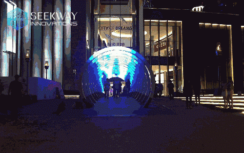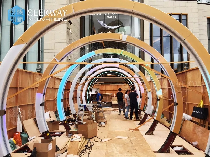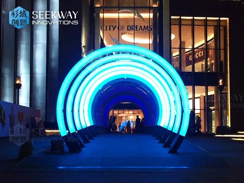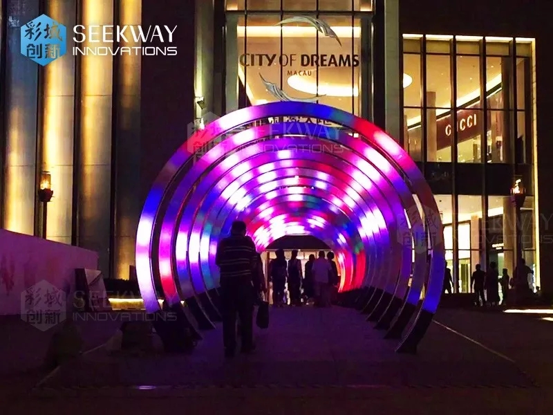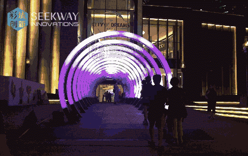 “时光通道”由16个2.5米高的拱形光环组成,设计概念来源于新濠天地的品牌形象,游客穿行其中仿如穿越时空,在声光电的感染下,放松心情开启度假时光。
