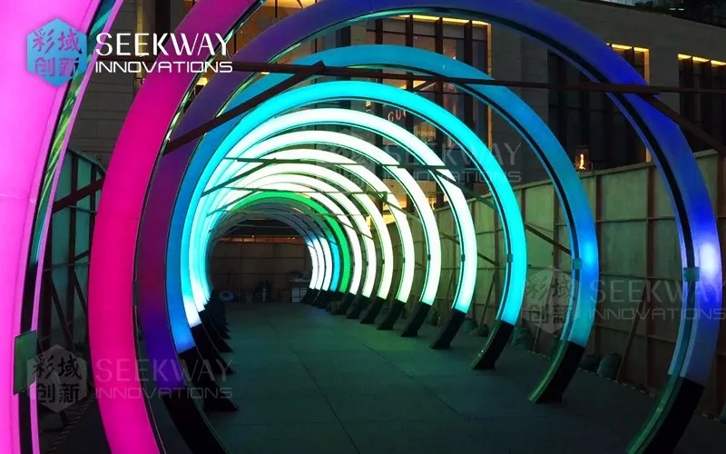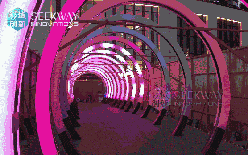 每当夜色袭来,装置也随之大放异彩,各个光环同步闪耀出夺目光辉,前后相接的光影将整条通道凝聚成大范围的炫彩空间,为游客带来新鲜的户外视觉体验。